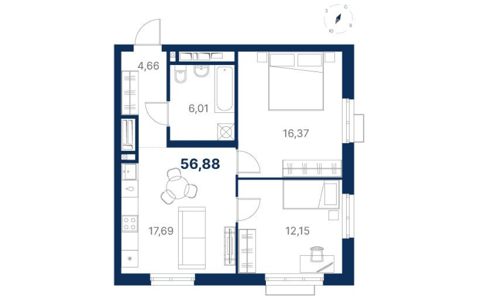 2-комнатная54.53 м2